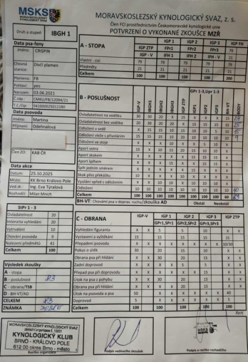 Jelikož se s vými psy nedělám stopu, obranu, ani překážky, zůstává Crišpovi poslední zkouška z poslušnosti, a to IBGH-1, která se konala dne 25.10.2025 v KK Brno - Královo Pole. Je to v podstatě obdoba zkoušky BH-VT, kterou dnes dělal Shermann, takže jsem měla s sebou oba kluky :-)